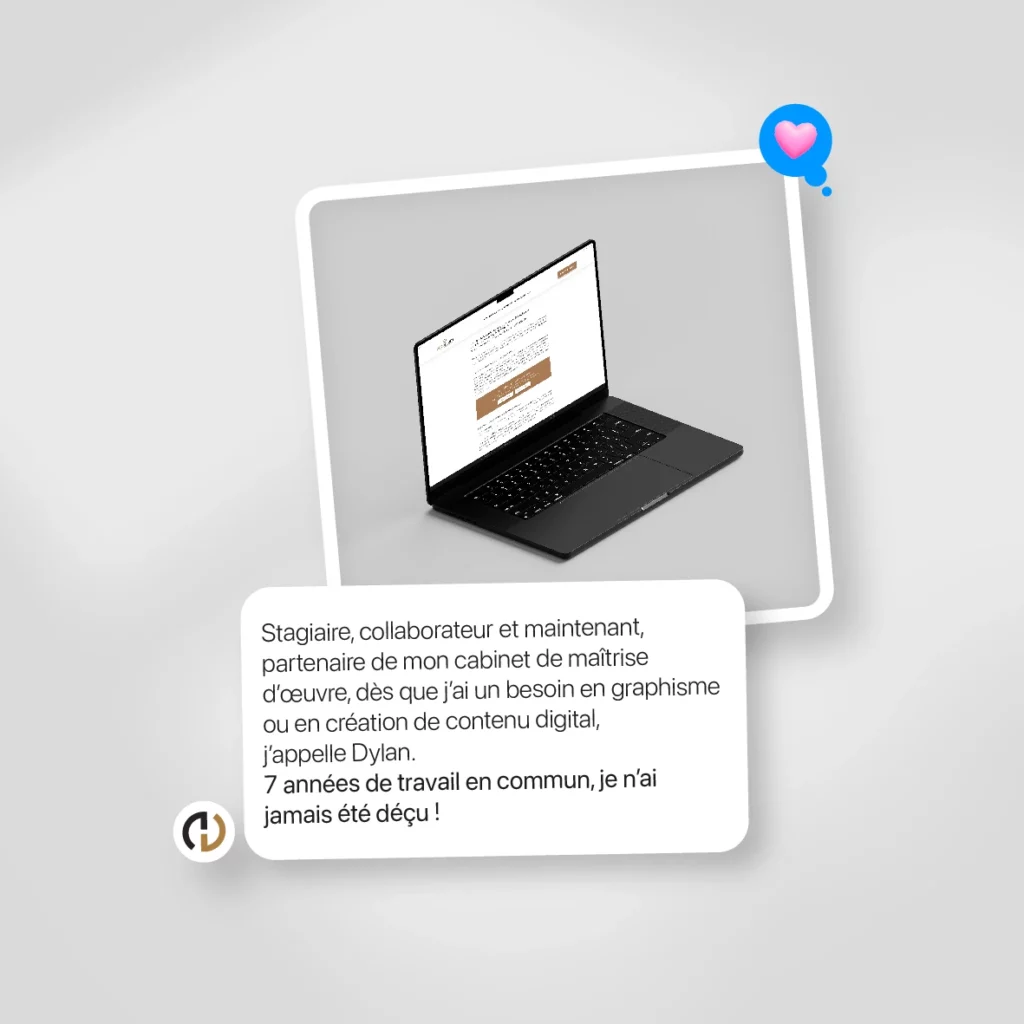 « Stagiaire, collaborateur et maintenant, partenaire de mon cabinet de maîtrise d’œuvre, dès que j’ai un besoin en graphisme ou en création de contenu digital, j’appelle Dylan. 7 années de travail en commun, je n’ai jamais été déçu ! »