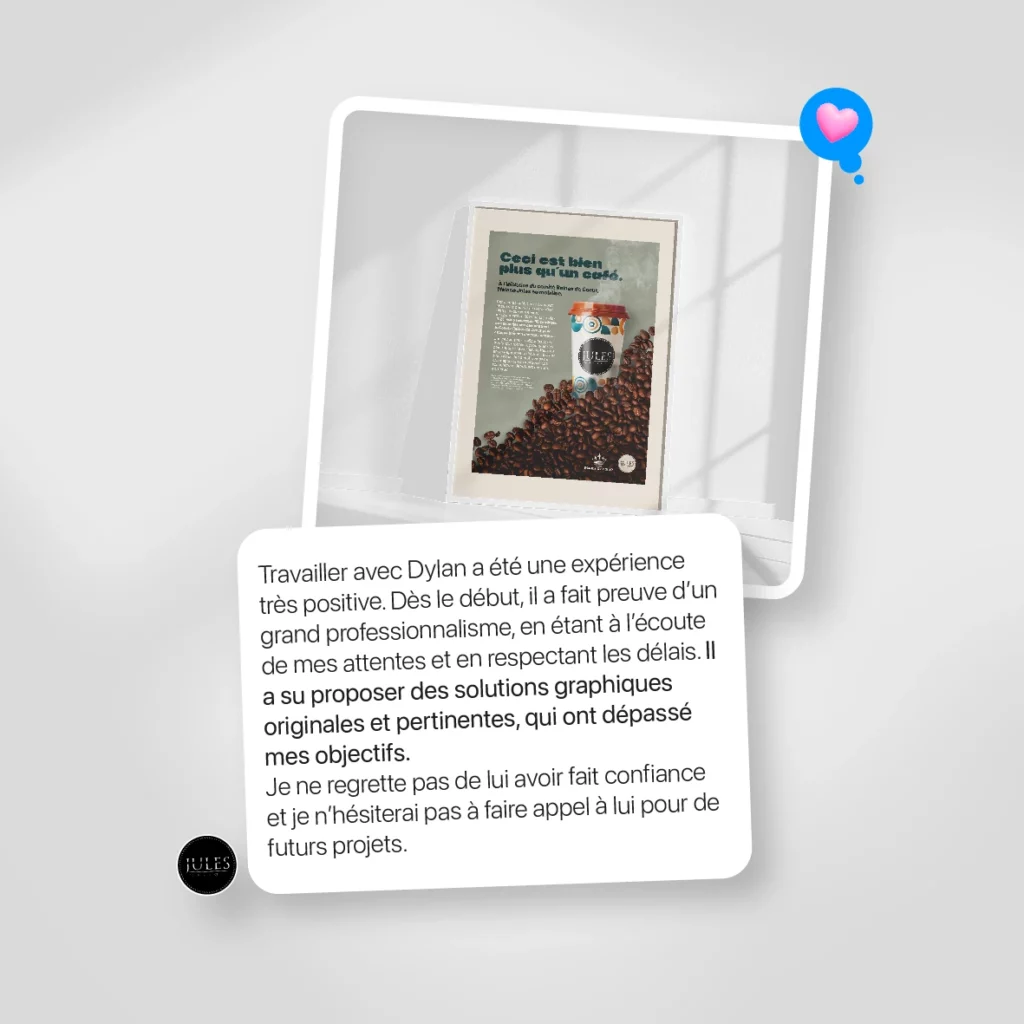 « Travailler avec Dylan a été une expérience très positive. Dès le début, il a fait preuve d’un grand professionnalisme, en étant à l’écoute de mes attentes et en respectant les délais. Il a su proposer des solutions graphiques originales et pertinentes, qui ont dépassé mes objectifs.